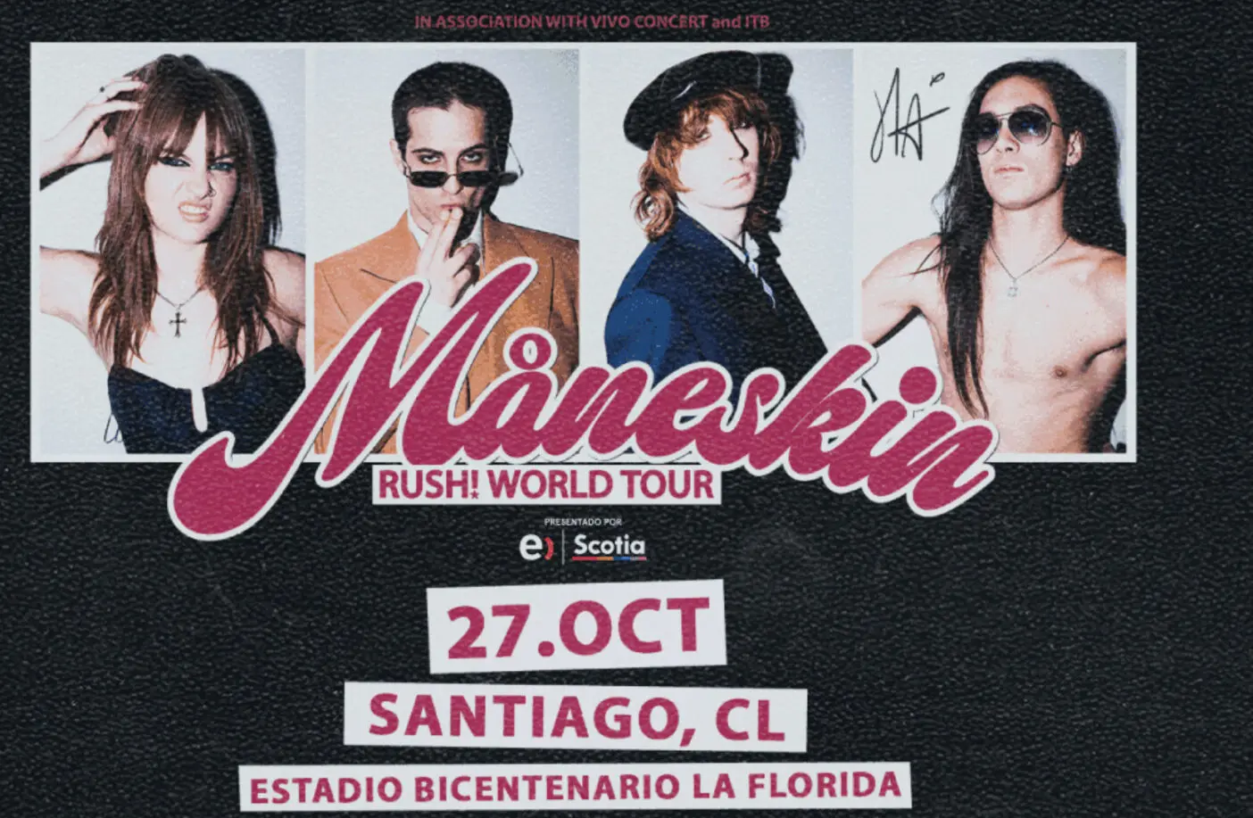 Como parte de su gira mundial por el lanzamiento de Rush!, su tercer álbum de estudio, Måneskin se presentará en el Estadio Bicentenario de La Florida el próximo 27 de octubre. Es su segundo concierto en Chile, luego de haber debutado en Movistar Arena el año pasado.