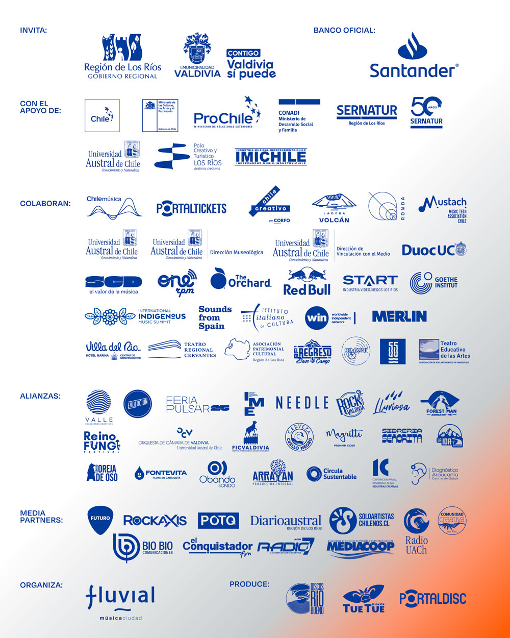 | “Fluvial sigue creciendo como un laboratorio de música, territorio y colaboración. En Valdivia encontramos un ecosistema natural y cultural único; un lugar donde la creatividad dialoga con los ríos y los bosques, y donde la música se piensa no sólo como industria, sino también como comunidad y modelo de desarrollo. Invitamos a todas y todos a vivir Fluvial 2025, un encuentro que celebra la música, el territorio y las redes que nos conectan con el mundo”. |