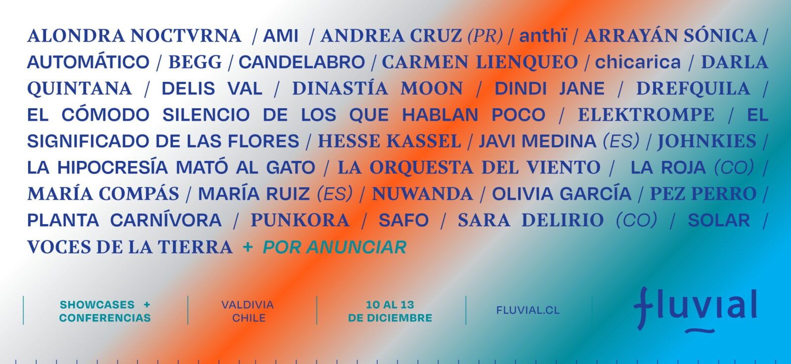 La parrilla artística de Fluvial 2025 destaca por su amplitud y por la riqueza de sus cruces estéticos. La curatoría reúne propuestas de pop alternativo, música de raíz, electrónica, jazz, hip-hop y escenas experimentales, dando cuenta del momento diverso que vive la creación musical chilena. Figuran tanto artistas consolidados, como voces emergentes que están renovando sus territorios creativos. La presencia de invitados internacionales —entre ellos Laila Al Habash (Italia), Shauit (Canadá), y dos proyectos de España— amplía el espectro y abre nuevas posibilidades de colaboración. Con más de 40 showcases en cinco escenarios, esta edición ofrece un line-up atractivo, contemporáneo y profundamente conectado con las distintas realidades sonoras del sur del mundo.