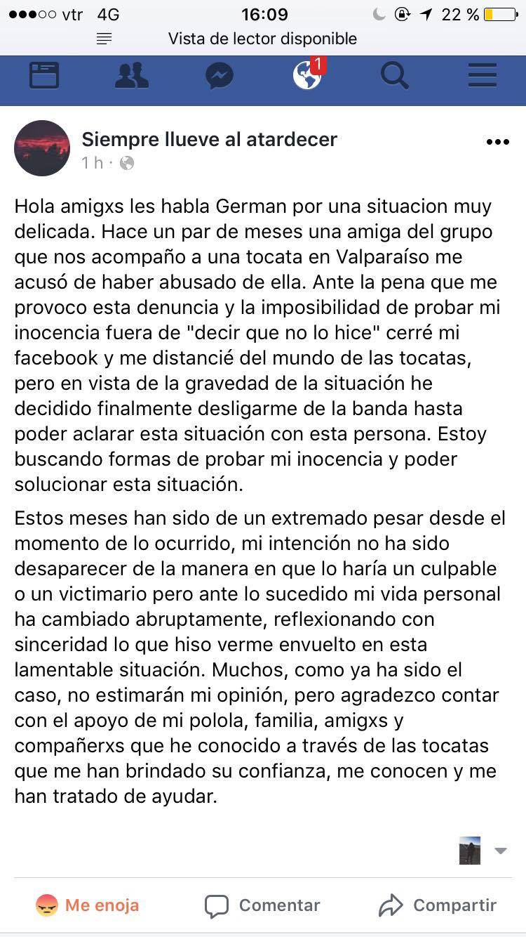 Pero hoy sí lo publiqué con su nombre, porque después de nuestra reunión del domingo 5 de noviembre, pasaron cosas. En primer lugar, muchos hombres músicos de este círculo de bandas se enteraron que nos reunimos. Sabían que estaba pasando algo, que las mujeres con las que trabajan y se relacionan se estaban juntando entre ellas. Algunos comenzaron a desesperarse, como habitualmente lo hacen los culpables. Uno de ellos fue Germán de Siempre Llueve al Atardecer. Durante la semana usó un estado de Facebook en el fanpage (ahora eliminado) de su banda para ponerse el parche antes de la herida, en caso de que Manuela hablara.