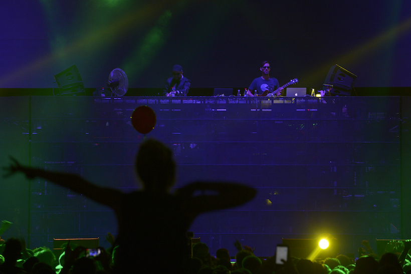 Mientras la balsa de plástico seguía surcando cabezas apareció Skrillex para acompañar a RL Grime en la parte final de su set, lo que desató la euforia aún más. Si eso era posible. Pero el ambiente era muy diferente en ambos lugares. Afuera Noel Gallagher reinterpretaba una música que ya nació vieja. Las diferencias entre ambos públicos eran notables. Mientras en el caso del roquero inglés el público -fuera de los fans realmente involucrados- miraba esperando a que pasase algo, en el Dj Set del Movistar Arena no había que esperar a que pasase algo, porque algo estaba pasando todo el rato. Las diferencias eran observables. En tanto que para el ex Oasis había más gente dormitando o tumbadas sobre el pasto, haciendo que el concierto fuera una banda sonora de fondo, un muzak del que sólo se desperezan si alguien los pisa para atravesar ese campo lleno de personas entre el sueño y la vigilia, dentro no había ese problema. Todos y cada uno de los asistentes estaba concentrado en pasárselo bien, en compartir con los desconocidos que lo rodeaban. Un rato después Zeds Dead con su mezcla entre trap, EDM y grime hacía bailar sin descanso a los asistentes Mientras, afuera, el rock simplón y plano de Mumford and Sons convocaba a otros miles de personas. Muchas de ellas sin fuerzas sobre la hierba.