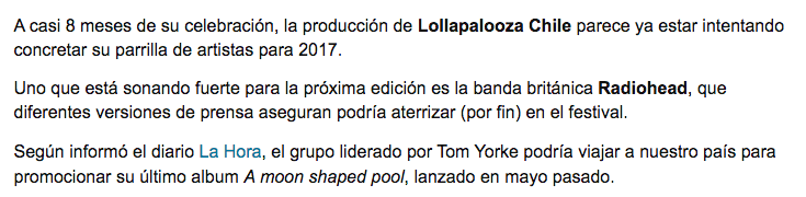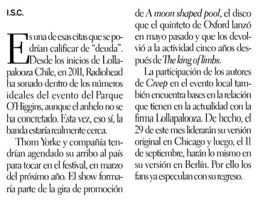 Pero esto no queda acá ¡Hoy nos enteramos que “podríamos” escuchar ‘Creep’ en vivo, en Lollapalooza 2017! Una gran noticia, publicada en el diario La Hora, en papel, el día de hoy:
