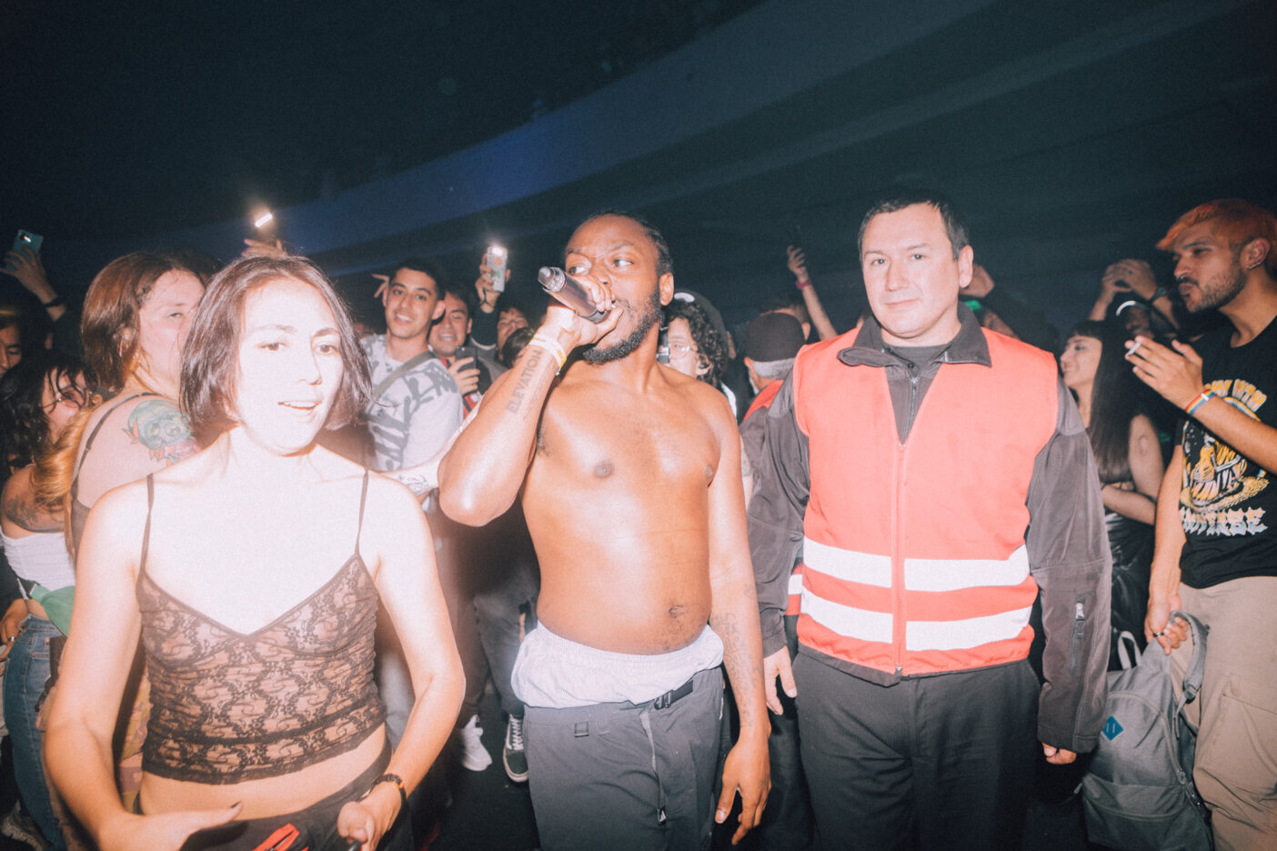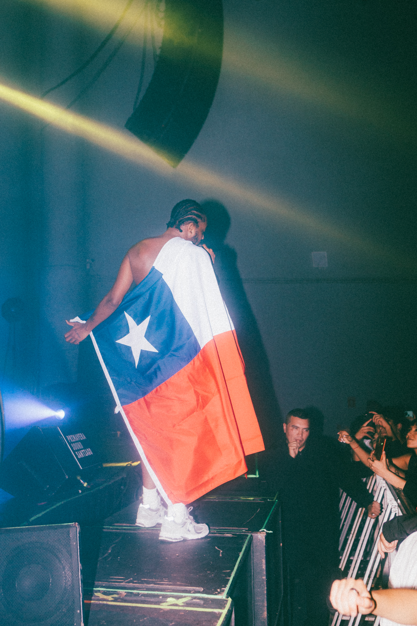 Pero todo lo bueno se acaba, y después de el cansancio y sudor post-Boy-Harsher, llegaba el turno de Lord Apex. El MC britanico se subió al escenario con la bandera chilena a modo de turbante y prendió un porro mientras su hype man pedía a los chilenos que hicieran un ruido.