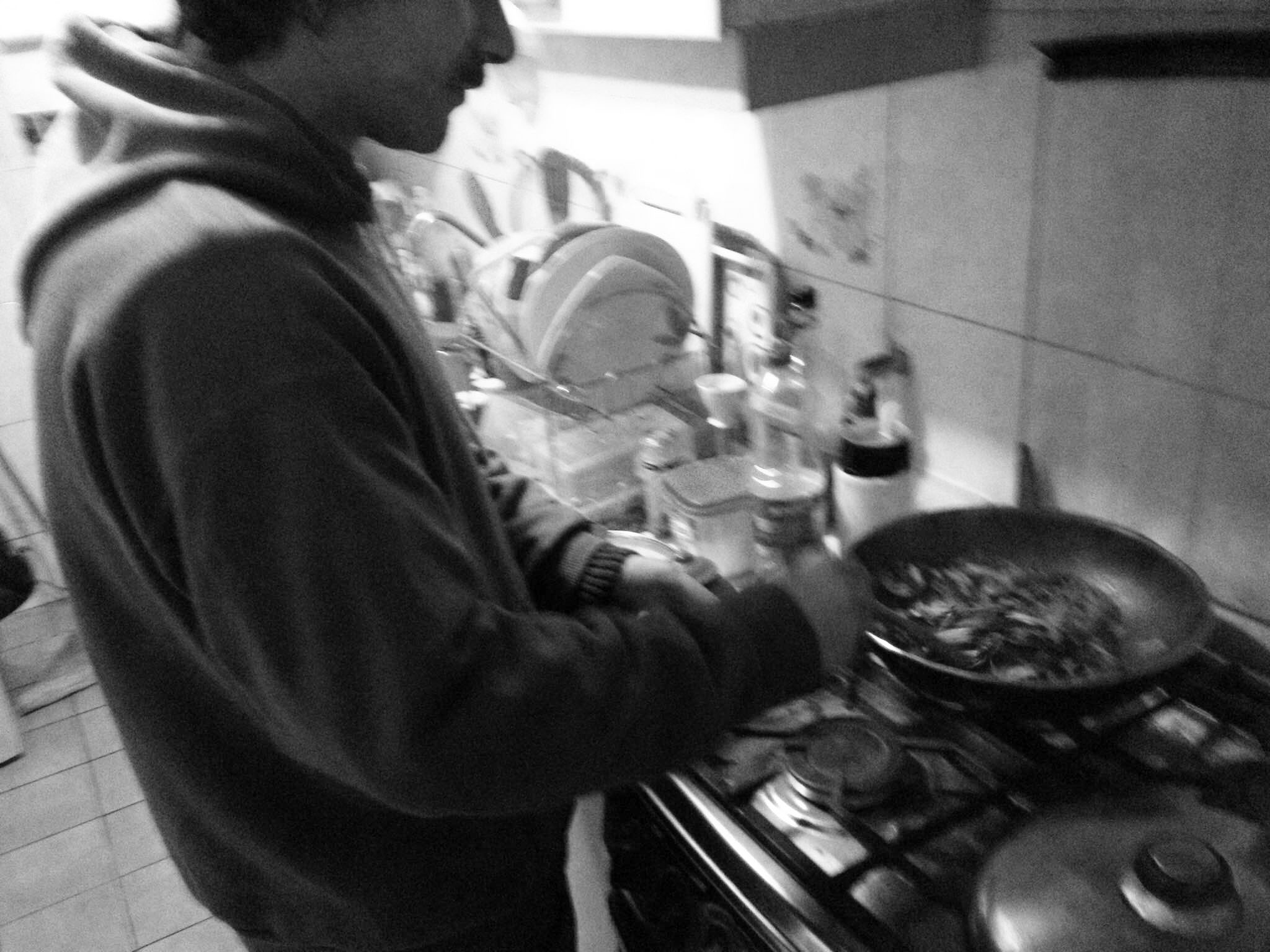 Queríamos saber más de ellos, y para hacer eso posible, ideamos el plan de invitarlos a cocinar, a modo de ejercicio creativo, como una especie de jam que en vez de instrumentos contó con cuchillería, cerveza y verduras. Ignacio y Tebo se disculparon por no poder asistir, pero contamos con la grata presencia de Juan Pablo y Yanara, quienes compartieron con nosotros una tarde-noche donde tratamos de sacar en limpio ideas compartidas y contrastadas ante una cena preparada con amor. Acompañó en la labor Kika, como cordial anfitriona.