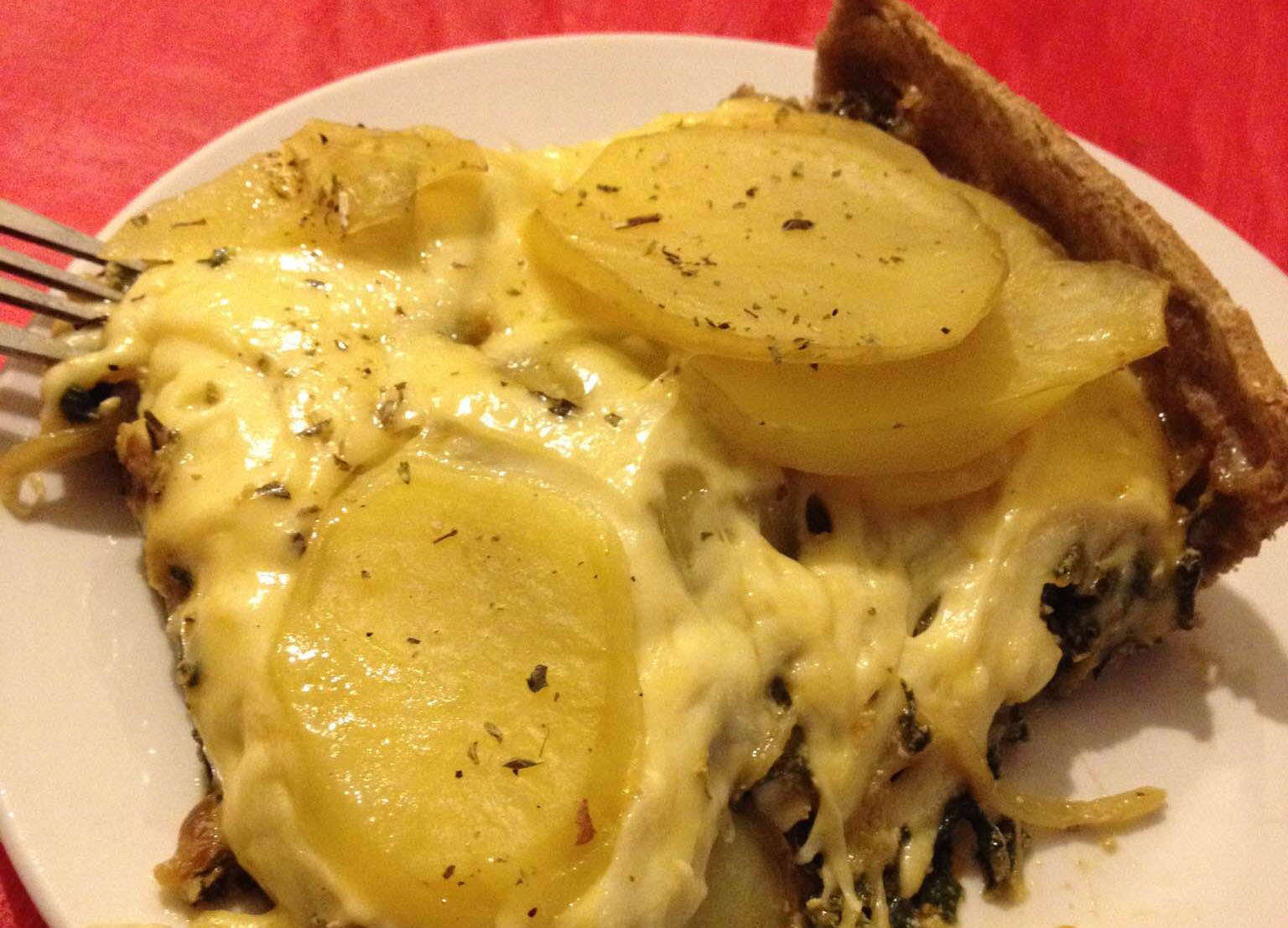 Precalentar el horno a fuego medio. En la bandeja con la masa, poner primero la mezcla. Sobre la mezcla, poner una capa de queso, luego las láminas de papa, luego la segunda capa de queso. Poner al horno durante 20 minutos, revisando.