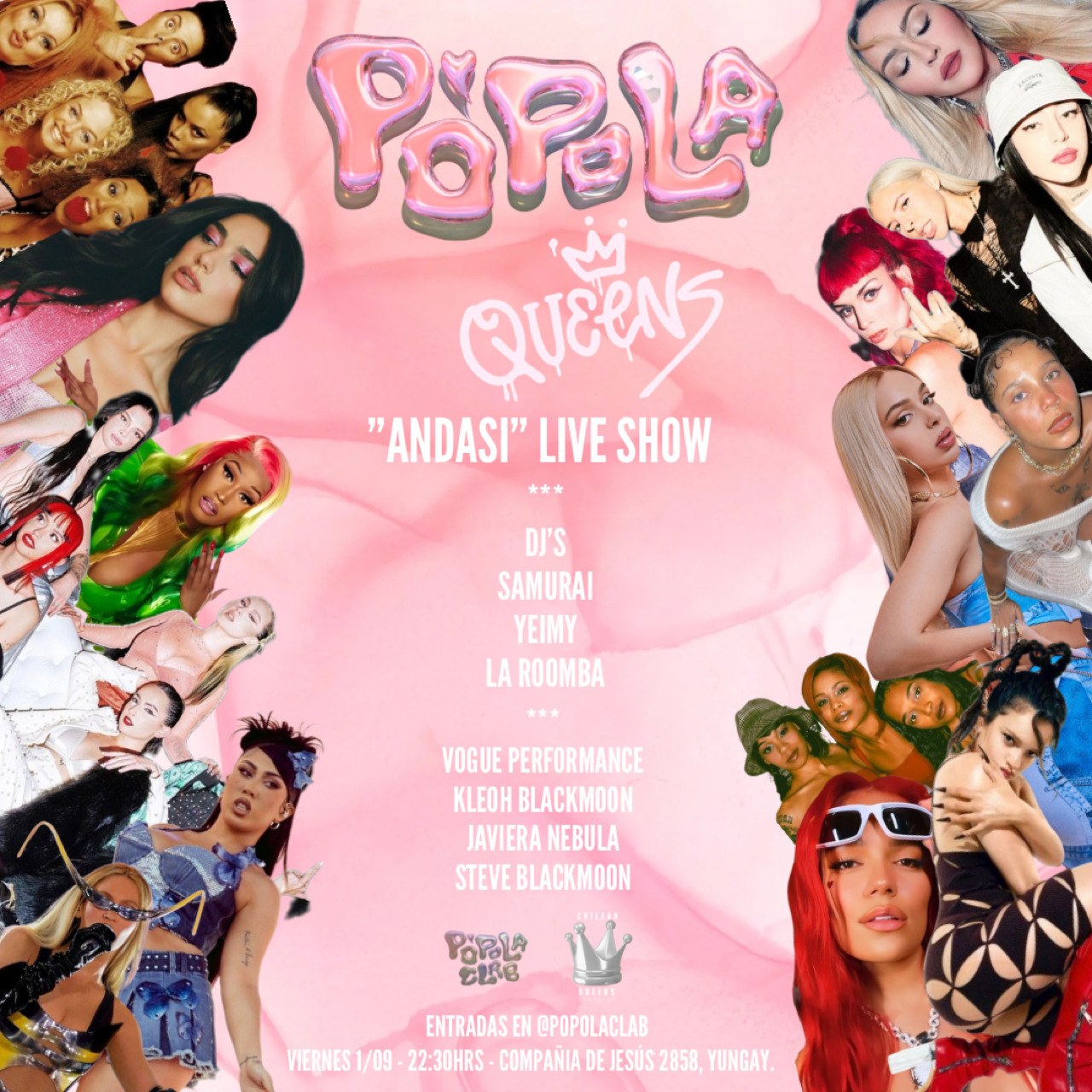 Hasta el momento, Popola lleva ocho ediciones de forma itinerante por la capital y el plan es poder sacar la fiesta a otras ciudades de Chile, dice Yeimy. Y este viernes 1 de septiembre se realizará una nueva versión, esta vez en colaboración con la plataforma Chilean Queens Playlist y tendrá la particularidad de que todos los sets estarán compuestos de voces femeninas, celebrando el pop, hip hop y reguetón hecho por mujeres y disidencias. Andasi realizará un live show y luego los dj sets estarán a cargo de Tesoro Samurai, Yeimy y La Roomba, además de las performance de voguing de @kleoh.blackmoon, @javieranebula y @steveoalgoasi.