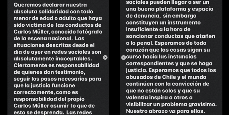 También se pronunció la agencia de prensa Collage: “manifestamos total apoyo a las víctimas de abuso por parte del fotógrafo Carlos Müller. Rechazamos cualquier conducta que atente con la seguridad de toda persona, sobre todo con la de menores de edad”.