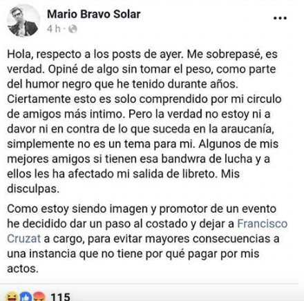 Sin embargo, el Aggrofest es noticia por algo más allá de lo musical. El productor del evento, Mario Bravo Solar, también director de la agencia Colorway y organizador de otros eventos musicales, ha saltado a la luz pública por sus ofensivas, inhumanas y despreciables opiniones sobre el conflicto de la Araucanía y el cobarde asesinato de Camilo Catrillanca, por parte de Carabineros. Mario Bravo dijo cosas como “Fumiguen la Araucanía y todas las zonas habitadas por Orco a nivel País”, o absolutas animaladas asquerosas como “Ya paren con el Mapache no va a revivir”.