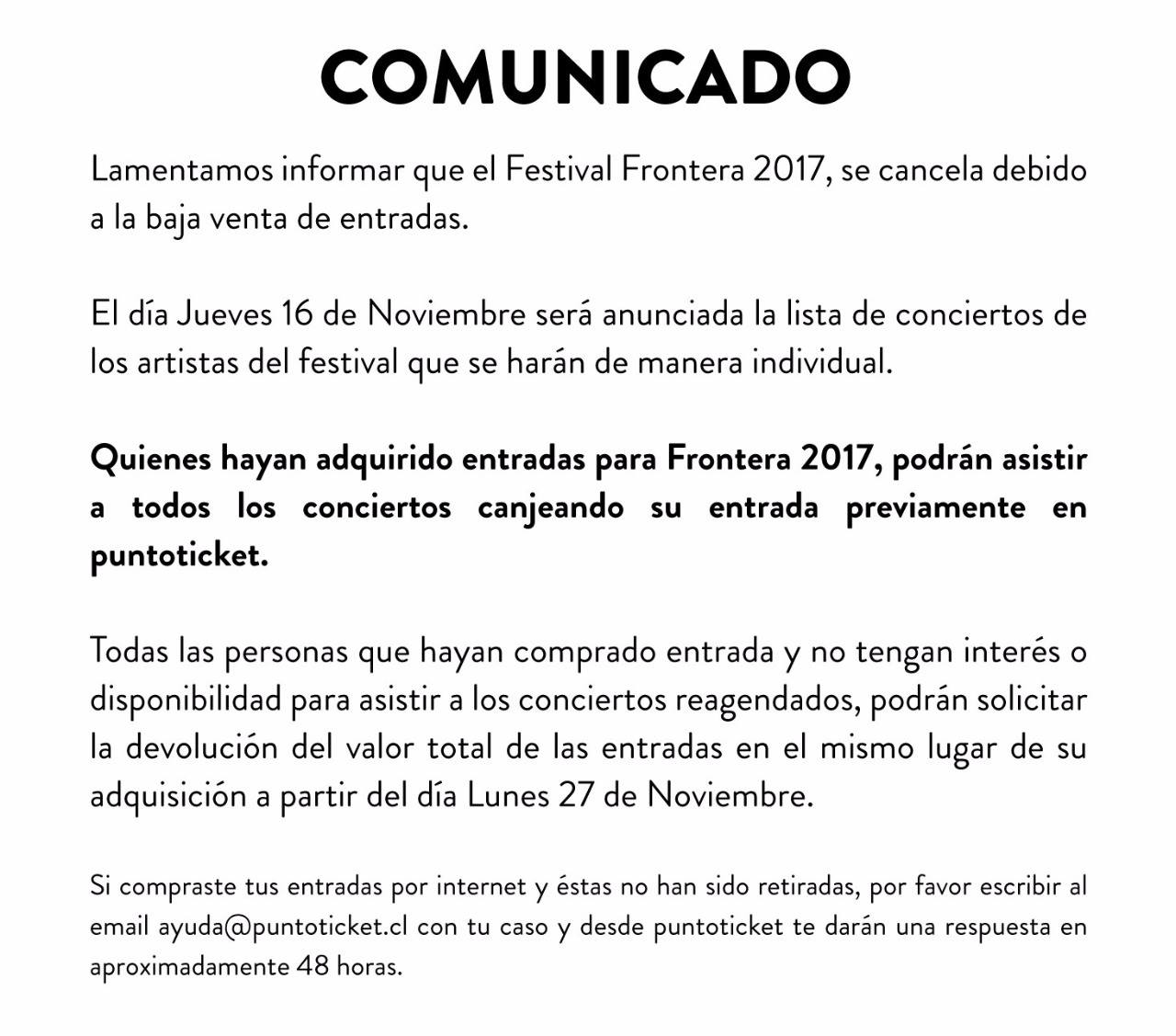 En el comunicado en su cuenta de Facebook oficial, además, explican que este 16 de noviembre, se anunciará una lista de los artistas que se estarán presentando de todas formas, de forma independiente.