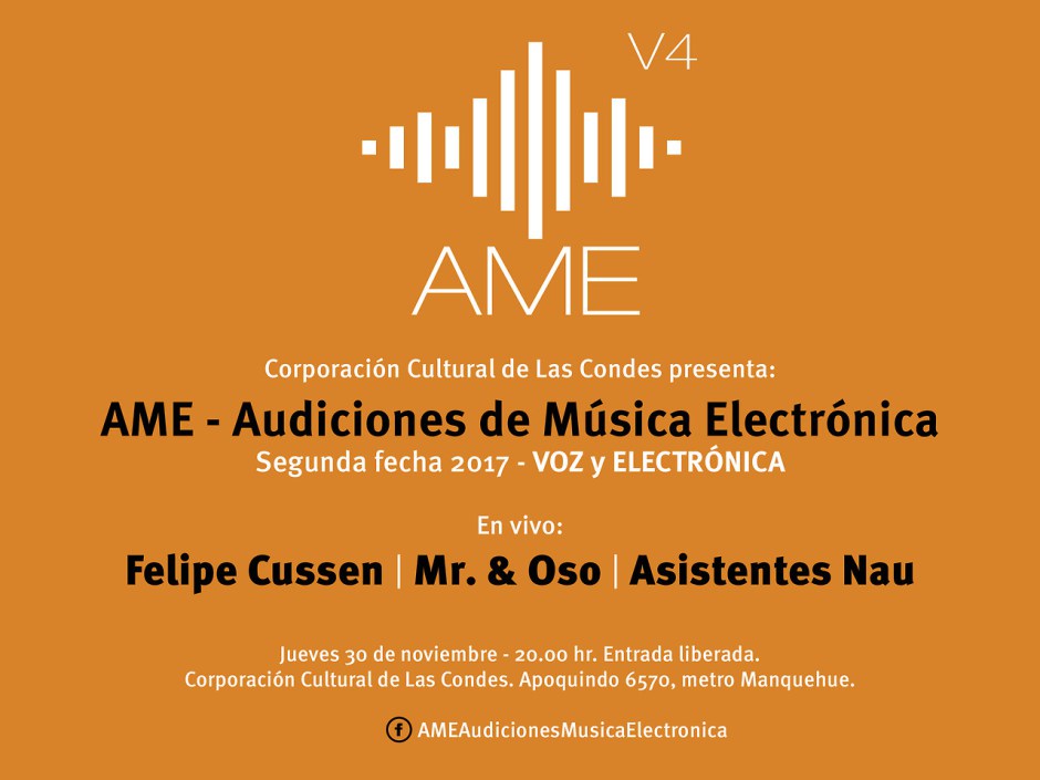 El Festival AME, o Audiciones de Música Electrónica, es un evento que tiene por finalidad mostrarnos la diversidad de estilos que rodean a la electrónica, incluyendo todo tipo de géneros y modalidades en estas presentaciones. La segunda fecha de 2017 de esta iniciativa mezclará sintetizadores y poesía, todo de manera gratuita este jueves 30 de noviembre en la Corporación Cultural Las Condes.