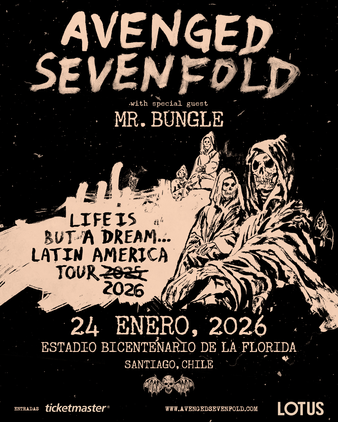 El próximo 24 de enero en el Estadio Bicentenario de La Florida, los íconos californianos del heavy metal, Avenged Sevenfold, sellan su regreso a Chile con su gira “Life is a but a dream…”. Reconocidos por su sonido diverso, el impactante diseño de sus álbumes y sus memorables presentaciones en vivo, es sin duda una de las bandas de rock más grandes e importantes de nuestro tiempo.