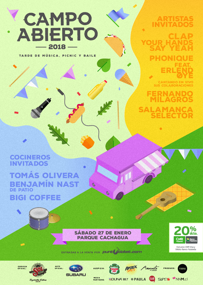 Fauna Producciones anunció hoy la edición 2018 de su evento Campo Abierto, el cual tendrá lugar el día sábado 27 de enero en el Parque Cachagua, en la comuna de Zapallar. El line up del evento está compuesto por Clap Your Hands Say Yeah, Fernando Milagros, Salamanca Selector y Phonique junto a Erlend Øye.