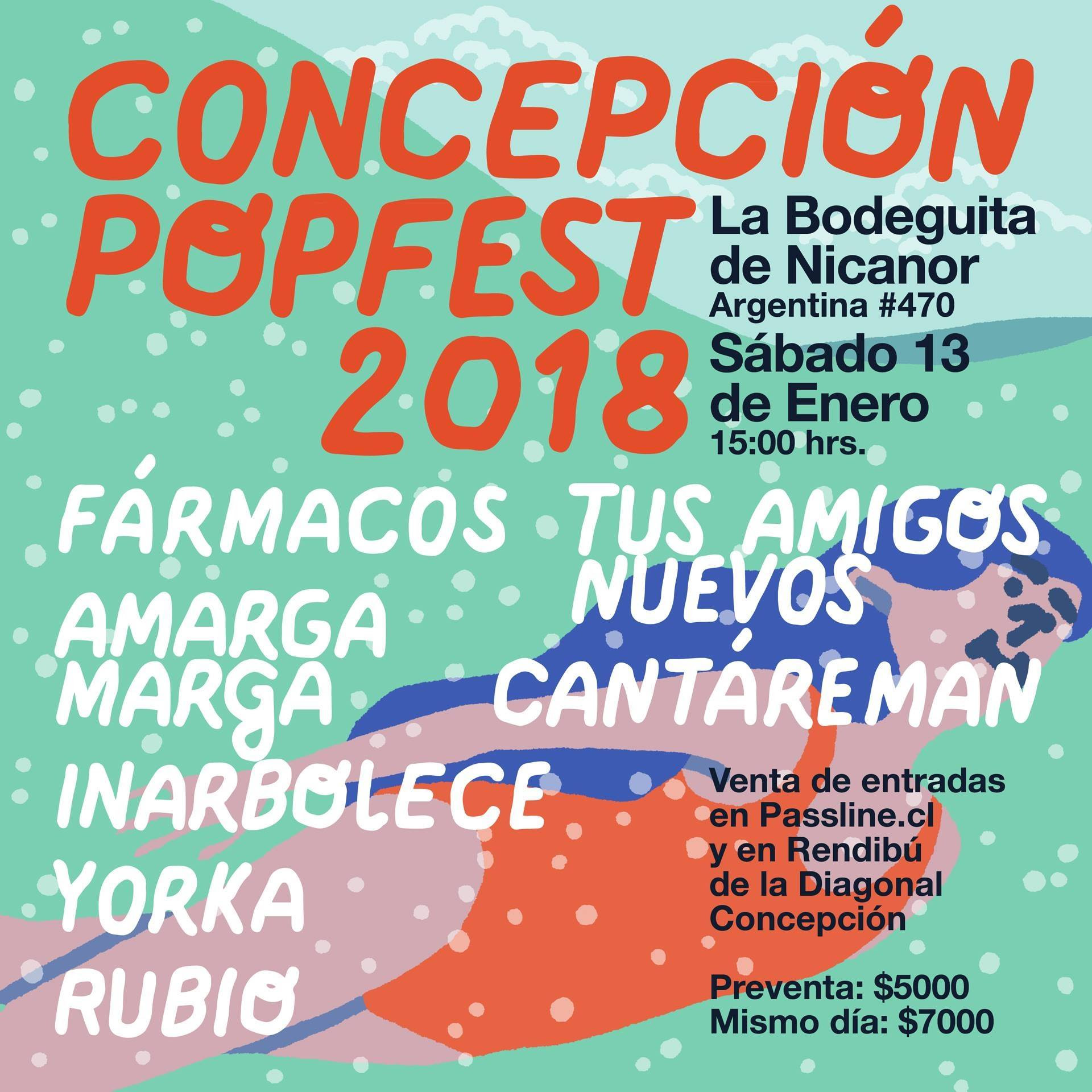 Por si alguien se preguntó si sólo existen festivales musicales autogestionados en Santiago, hoy respondemos que no, que este tipo de eventos también existen fuera de la capital, y que Concepción recibirá por segunda ocasión uno de estos encuentros. Concepción Pop Fest anunció hoy el cartel de artistas para su versión 2018, siendo este encabezado por Fármacos, Tus Amigos Nuevos y Amarga Marga, incluyendo también a Cantáreman, Inarbolece, Yorka y Rubio dentro de la nómina de proyectos participantes.