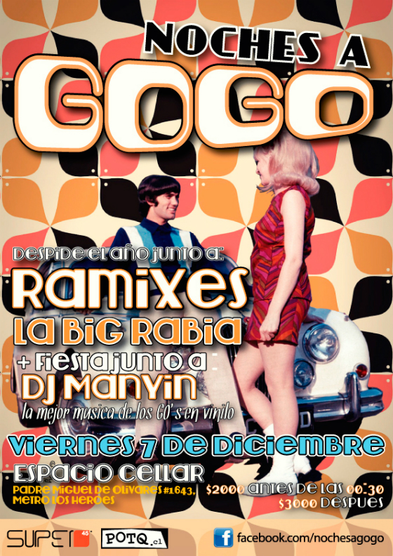 Este viernes, Noches a GOGO despide el 2012 con su última edición del año, la cual promete hacer bailar sin descanso a los asistentes al son de la mejor selección de éxitos de los ’60 junto a DJ Manyin y su arsenal de vinilos. Y, al igual que en sus versiones anteriores, habrá soul y rock & roll en vivo con las bandas Ramixes y La Big Rabia.