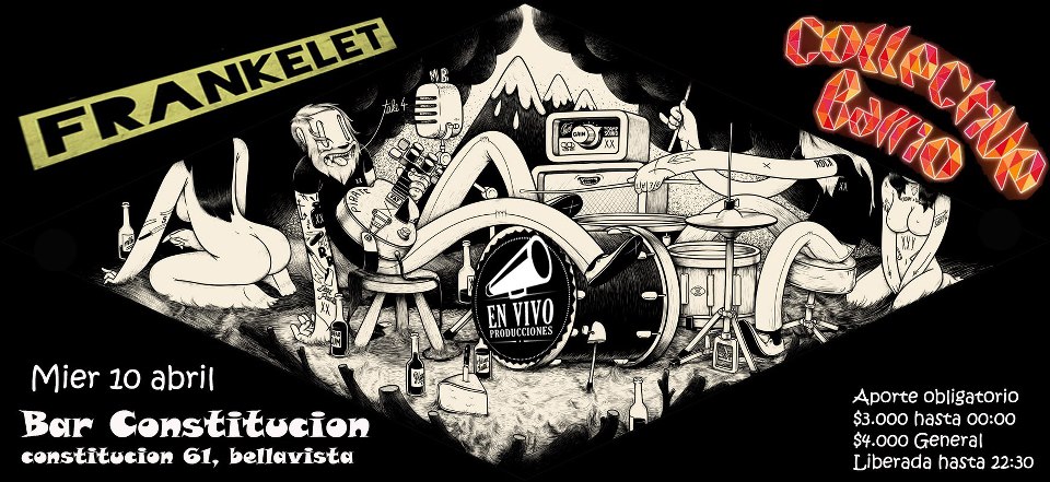 Este miércoles 10 de abril EnVivo Producciones nos presentan las bandas Frankelet y Collective Barrio en bar Constitución El show comienza a las 23:30 hrs. con todo el rock experimental de Frankelet, quienes ya han adelantado 2 singles de su próximo y segundo disco titulado “Disco Numero Dos”. La noche la coronará Collective Barrio con su mezcla cumbia, reggae y hip – hop. (descarga su disco haciendo clickeando aquí.)