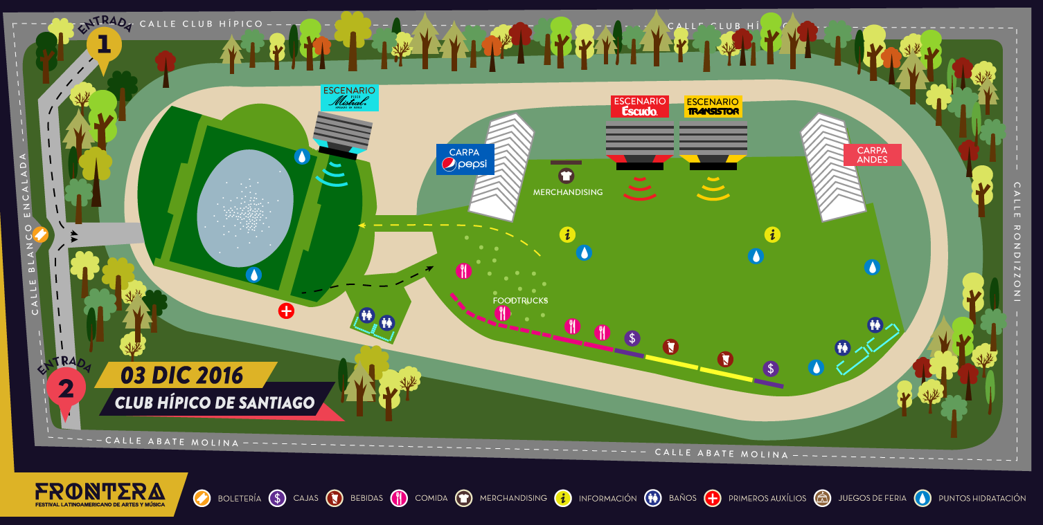 Tal como muestra el mapa, el festival contará con zonas para comprar alimentos y bebidas, además de foodtrucks con diferentes opciones de comida. Por otra parte, los ingresos al recinto se realizarán por Abate Molina y Av. Club Hípico. Por Blanco Encalada habrá una boletería de PuntoTicket donde estarán habilitados los sistemas de venta de entradas y will call.