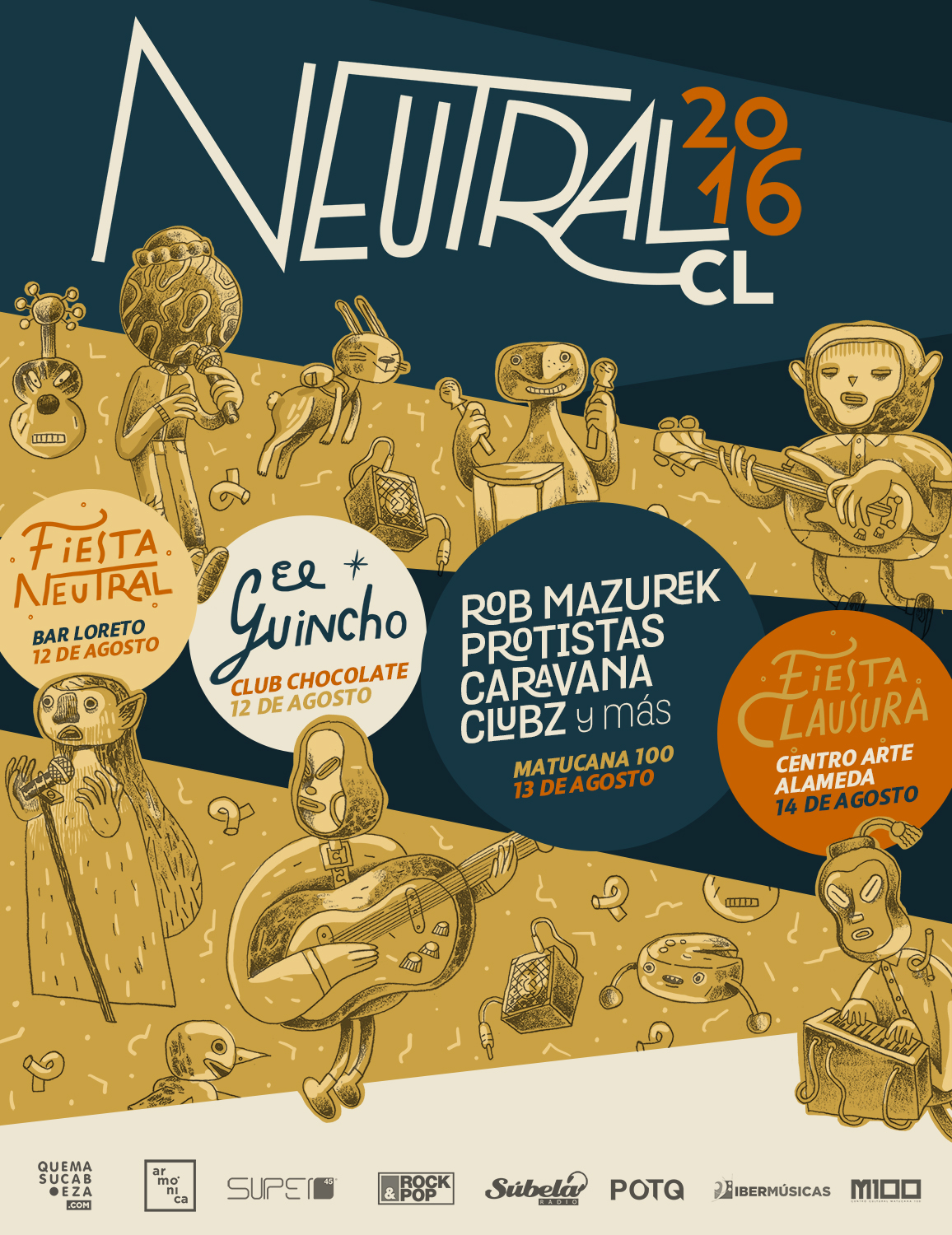 El sábado 13 el lugar que cobijará a Neutral será Matucana 100. La jornada estará marcada por la música experimental de Rob Mazurek (Chicago Underground Duo, Isotope 217) en la sala principal. También Caravana estará mostrando por primera vez Caminata, su segundo disco. La cita estará coronada con la participación de Clubz, electropop y guitarras mexicanas en formato dúo. Si aún te quedan fuerzas -esperamos que sí- el domingo 14 podrás asistir a la fiesta de clausura de Neutral, en Centro Arte Alameda.