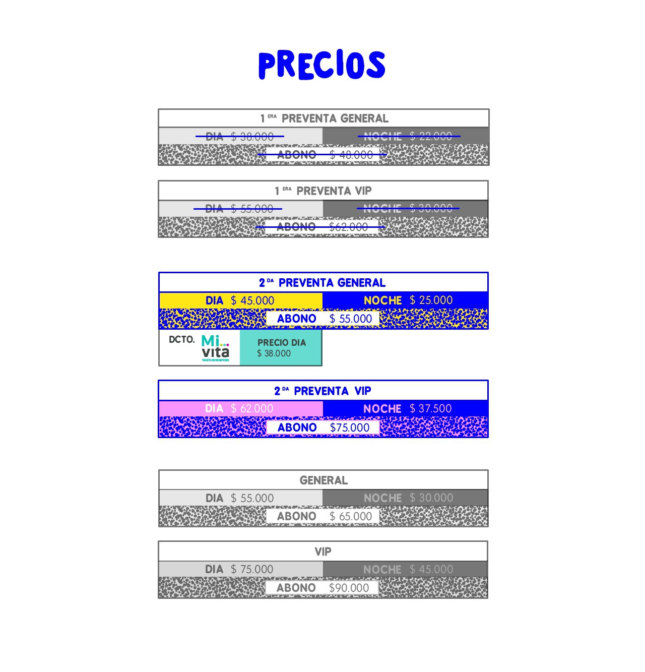 Las entradas de la segunda preventa se encuentran a la venta por medio del sistema Puntoticket, cuyos valores son los siguientes:
