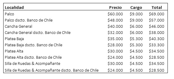 Las entradas se pondrán a la venta el día jueves a través del sistema Puntoticket, con valores que fluctúan entre los $28.500, hasta los $69.000 con recargo, sin embargo, los clientes del Banco de Chile podrán acceder a una preventa especial con un 20% de descuento mañana al mediodía. El detalle de precios lo encuentras al final de esta nota.