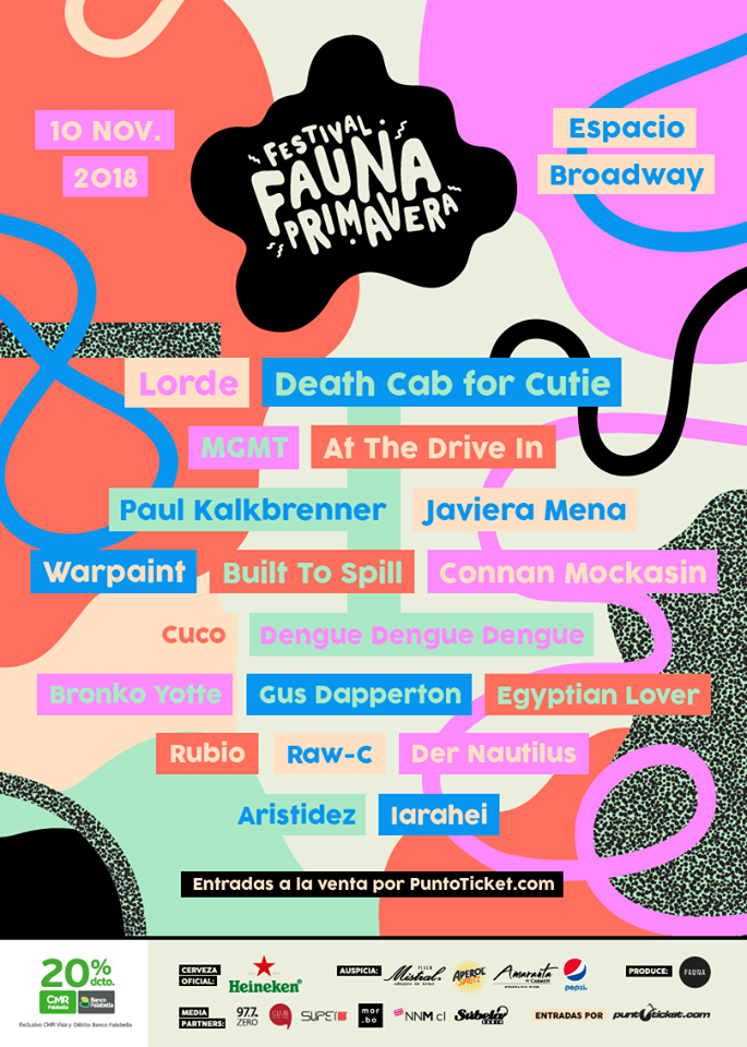 Junto a los ya confirmados At The Drive-in y Death Cab For Cutie, se suman también Lorde, MGMT, Paul Kalkbrenner, Javiera Mena, Warpaint, Built To Spill, Connan Mockasin, Cuco, Dengue Dengue Dengue, Bronko Yotte, Gus Dapperton, Egyptian Lover, Rubio, Raw-C, Der Nautilus, Aristidez y Iarahei, quienes se presentarán este sábado 10 de noviembre en el ya clásico spot de este evento musical, el Espacio Broadway.