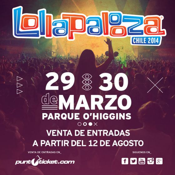 Sábado 29 y domingo 30 de marzo, en el Parque O’Higgins de Santiago. Ésas son las coordenadas de Lollapalooza Chile 2014, festival cuya venta de entradas comienza el próximo lunes 12 de agosto en modalidad Early Bird.