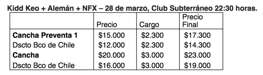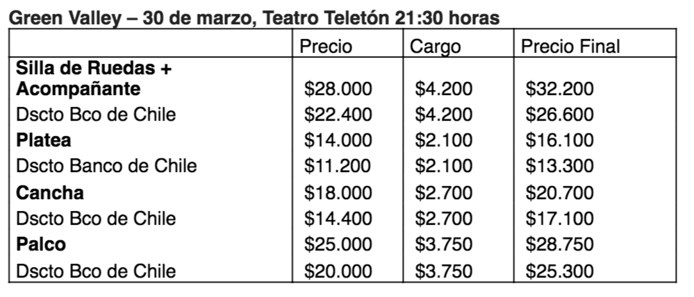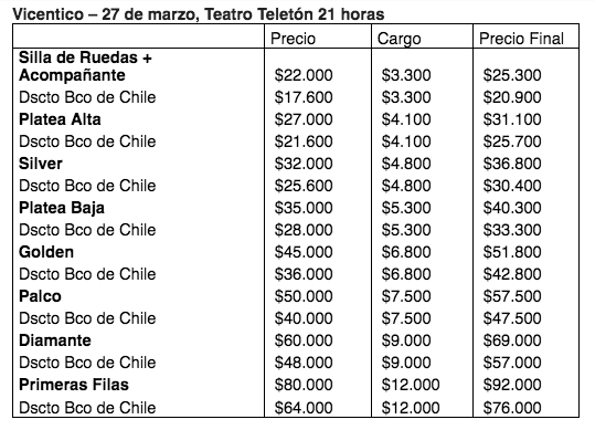 En tanto, Vicentico actuará el mismo 27 de marzo, en el Teatro Teletón. Por este cambio de locación, las entradas ya compradas serán reubicadas de acuerdo a la ubicación que compraron los asistentes. Si lo hiciste por internet, nuevos e-tickets serán enviados a tu correo con tu nuevo asiento. Si compraste en Punto de Venta, debes escribir a [email protected] y solicitar sus nuevas entradas.
