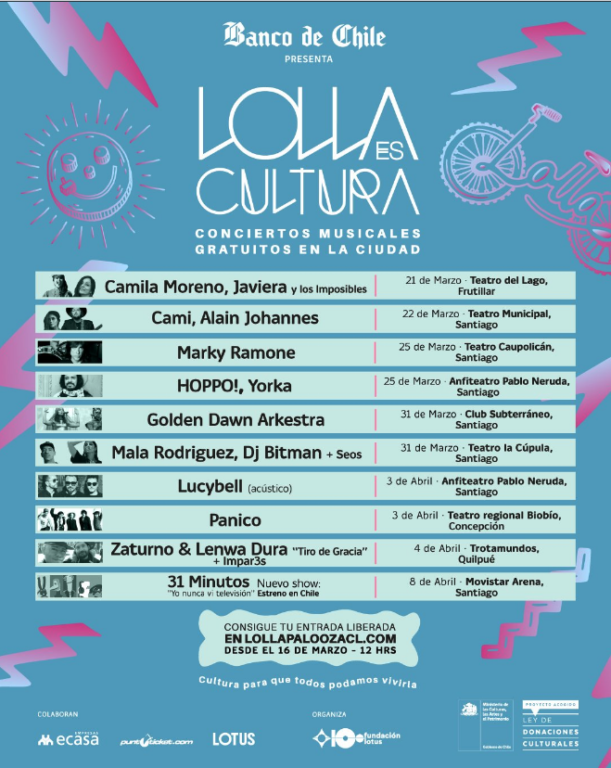 Lollapalooza Chile viene pisando firme con anuncios cada vez más sorpresivos, y es que este 2020 se cumplen 10 años desde su arribo a nuestro país, por lo que no solo están planeando hacer el típico festival, sino que ahora están pensando en grande y anunciaron shows gratuitos en cuatro ciudades diferentes del país: Santiago, Frutillar, Concepción y Quilpué.