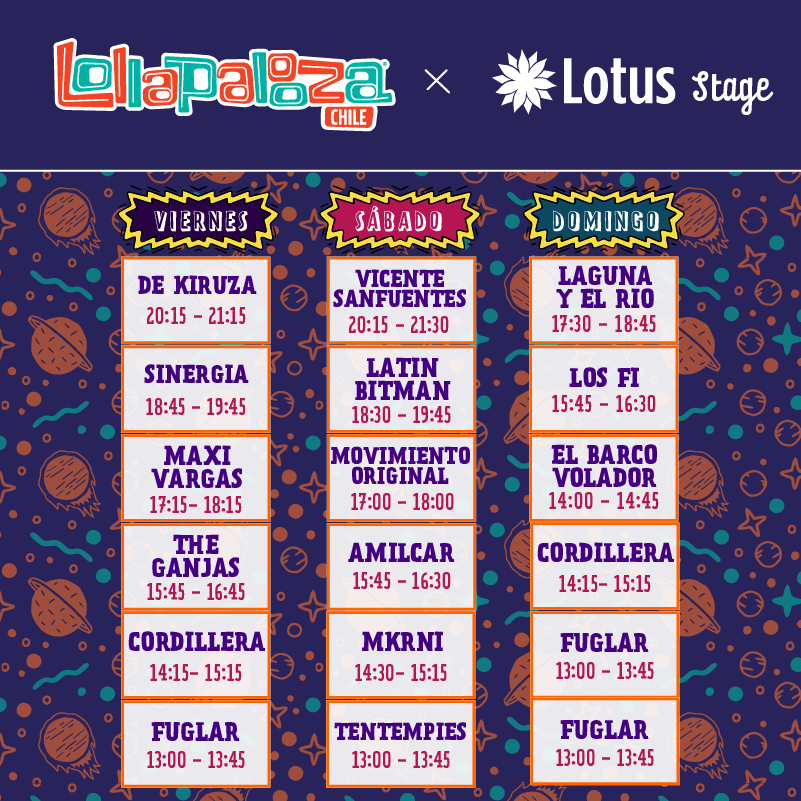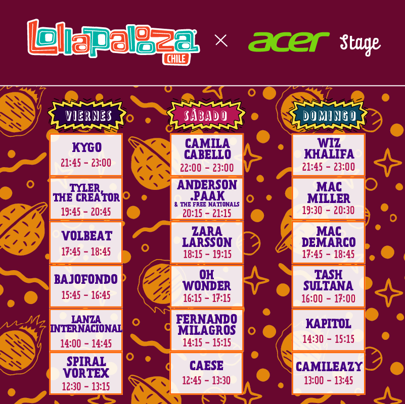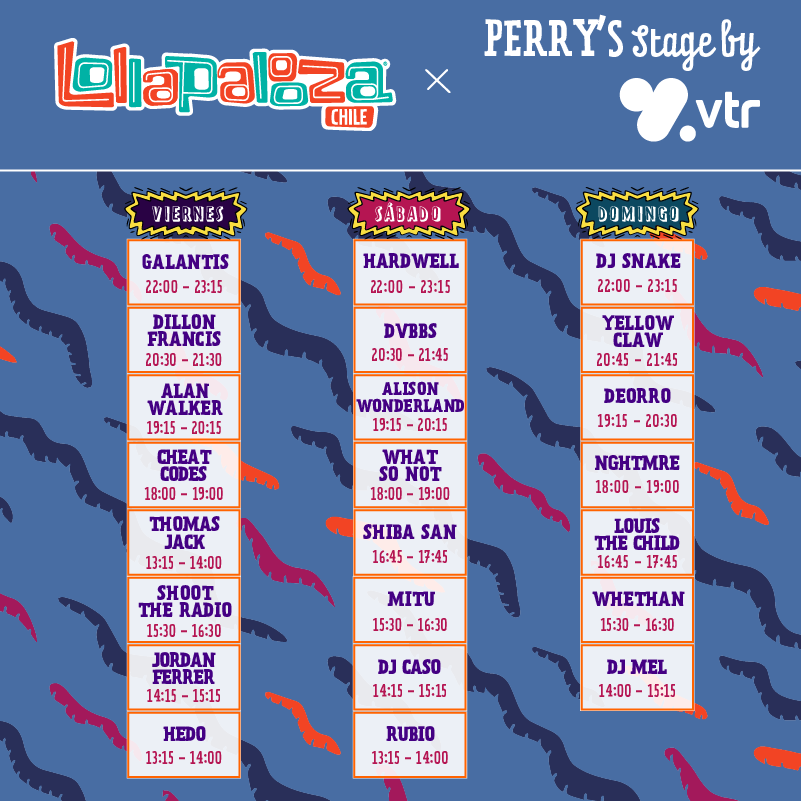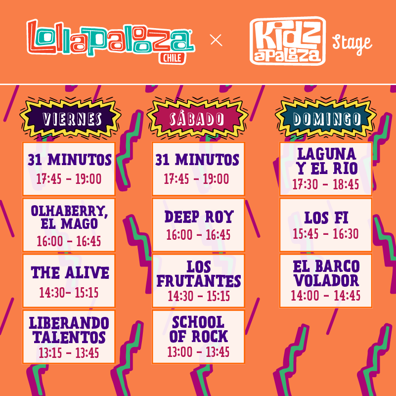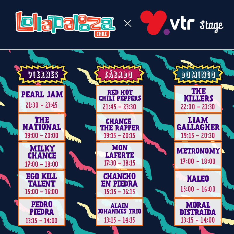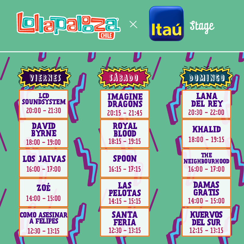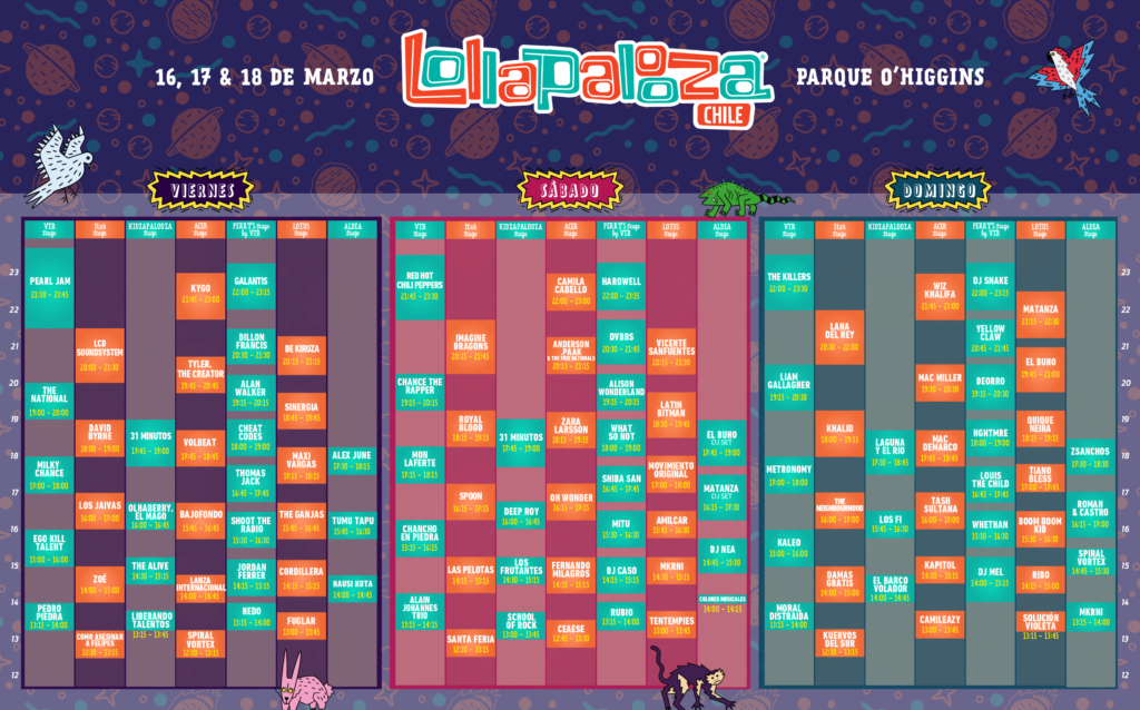 Finalmente, a lo que vinimos: los horarios de Lollapalooza Chile. Puedes revisar la malla de shows para los tres días a continuación, planificar tus tres intensas jornadas de festival, y quizás encontrarte con algunos de nosotros en el Parque O’Higgins (¡ups!). Te recordamos que las entradas siguen a la venta en Puntoticket, con precios que parten en los $112.000, hasta los $347.200.