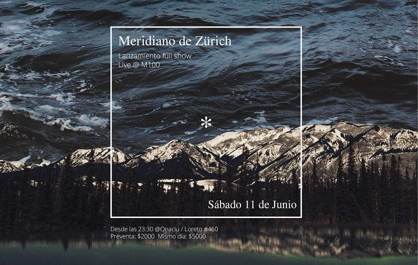 La banda nacional, Meridiano de Zürich lanzará el próximo sábado 11 de junio en Bar Onaciú (Loreto 460) su sesión en vivo grabada en M100 hace algunos meses. El espectacular show en vivo de la banda fue registrado de forma muy especial y promete ser un material de culto para los amantes del rock instrumental.