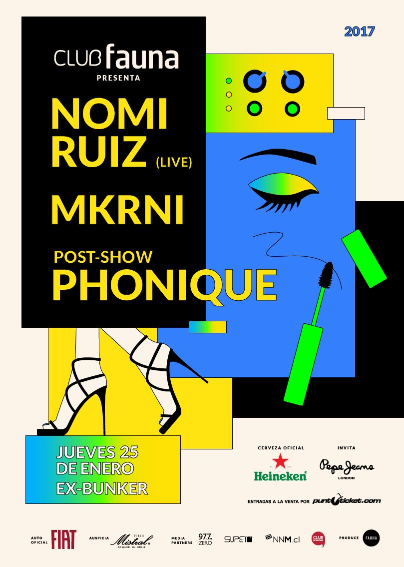 El 2018 se acerca a pasos agigantados, y ya empezamos a vislumbrar una agenda de conciertos bastante nutrida para el próximo año. El día de hoy fue anunciada la primera fecha de Club Fauna, la cual será conformada por Nomi Ruiz, MKRNI y el productor alemán Phonique, quienes se presentarán el día 25 de enero en la Ex-Búnker, con muchas ganas de hacernos bailar durante toda la noche.