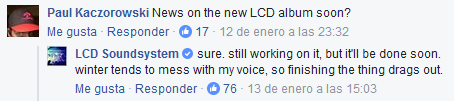 Hacia finales de 2015, James Murphy nos informaba a todos que su banda LCD Soundsystem se había vuelto a reunir tras un receso que duró cerca de cuatro años, y lo harían a lo grande, con nuevo álbum incluido. En 2016, la agrupación volvió a los escenarios, sin embargo del disco no se sabía absolutamente nada, o eso creíamos hasta ahora, ya que un fan preguntó inocentemente en Facebook si había algún adelanto preparado para la nueva placa, y el mandamás de DFA Records respondió con total sinceridad que sí.