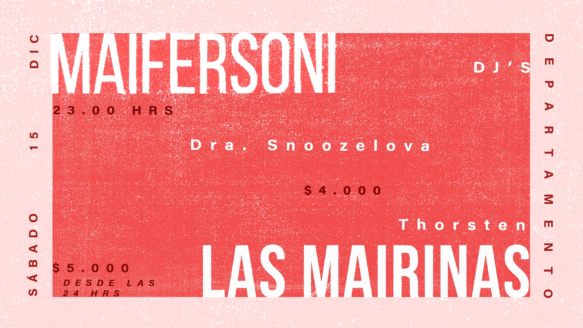 ¡El año se acaba, mas no los conciertos! Este sábado se juntan Maifersoni y Las Mairinas para dar un concierto en Departamento, locación ubicada cerca del Metro Santa Isabel que ha acogido muchas fechas interesantes durante el 2018. Además de estas dos destacadas bandas, habrá música a cargo de Dra. Snoozelova & Thorsten.