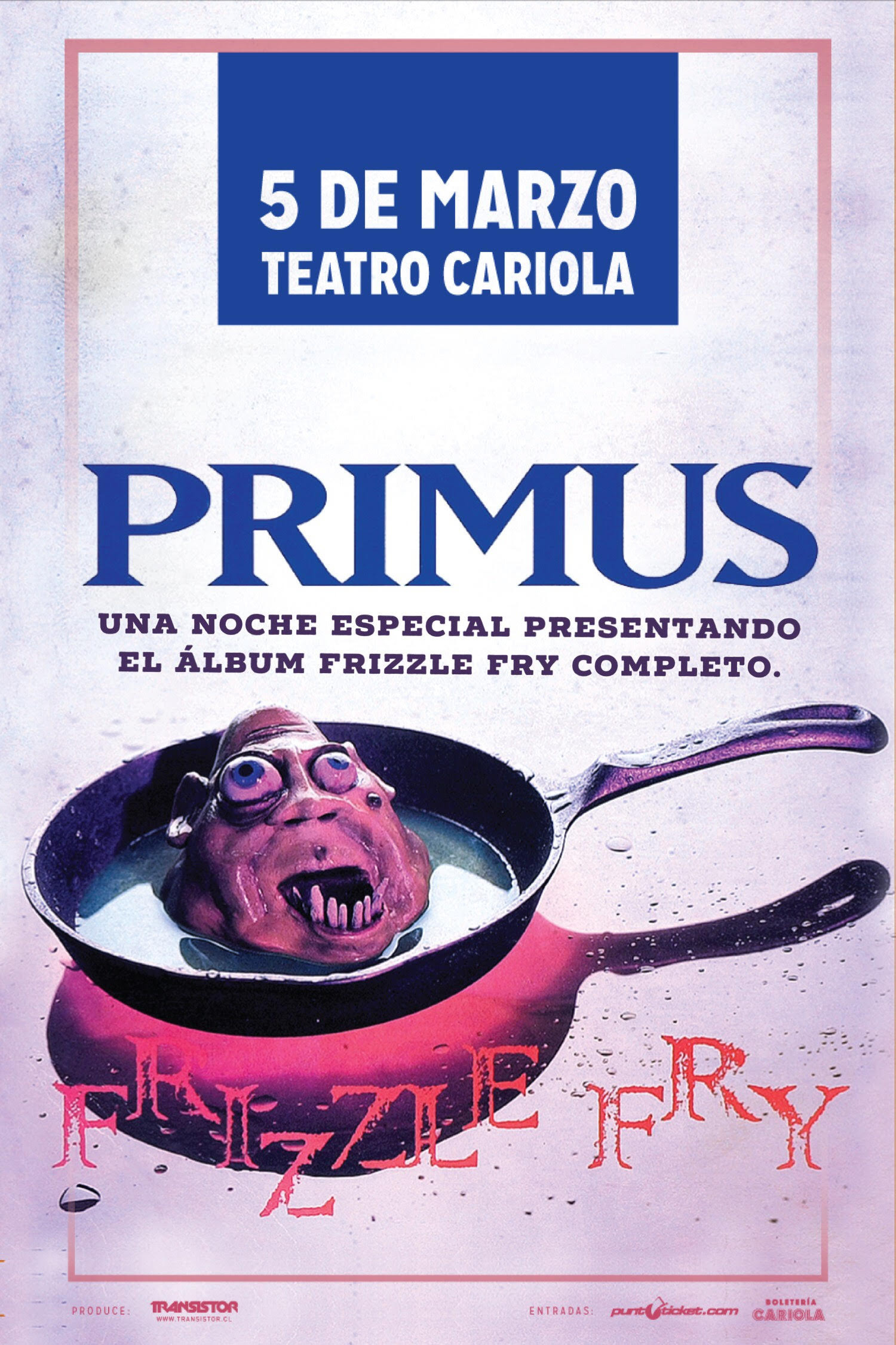 Luego de agotar tres fechas en el Teatro Municipal, Primus agenda un nuevo concierto para el 5 de marzo en el Teatro Cariola para presentar Frizzle Fry, su disco debut, lanzado en 1990, que incluye los singles ‘Too Many Puppies’ y ‘Mr. Knowitall’.