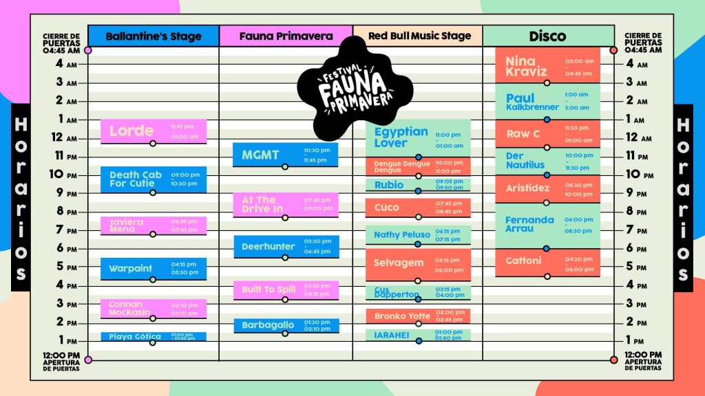 Almuerzo con Playa Gótica y el desayuno con Nina Kraviz. El Festival Fauna Primavera 2018 reveló los horarios de su nueva edición, a realizarse, nuevamente, en el Espacio Broadway por más de 15 horas. Como Chile ya nos acostumbró, la fiesta va a partir con mayoría local en los primeros bloques.