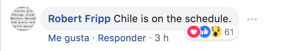 De la manera más inesperada, el propio Robert Fripp ha adelantado que los míticos King Crimson vendrán a Chile en 2019, dentro de su gira 2019 Celebration Tour. En una actualización en su página de Facebook habló de que ya estaban cerradas las fechas para la gira para Europa, Norteamérica y Sudamérica, pero que no se podían anunciar por deferencia a los promotores locales.