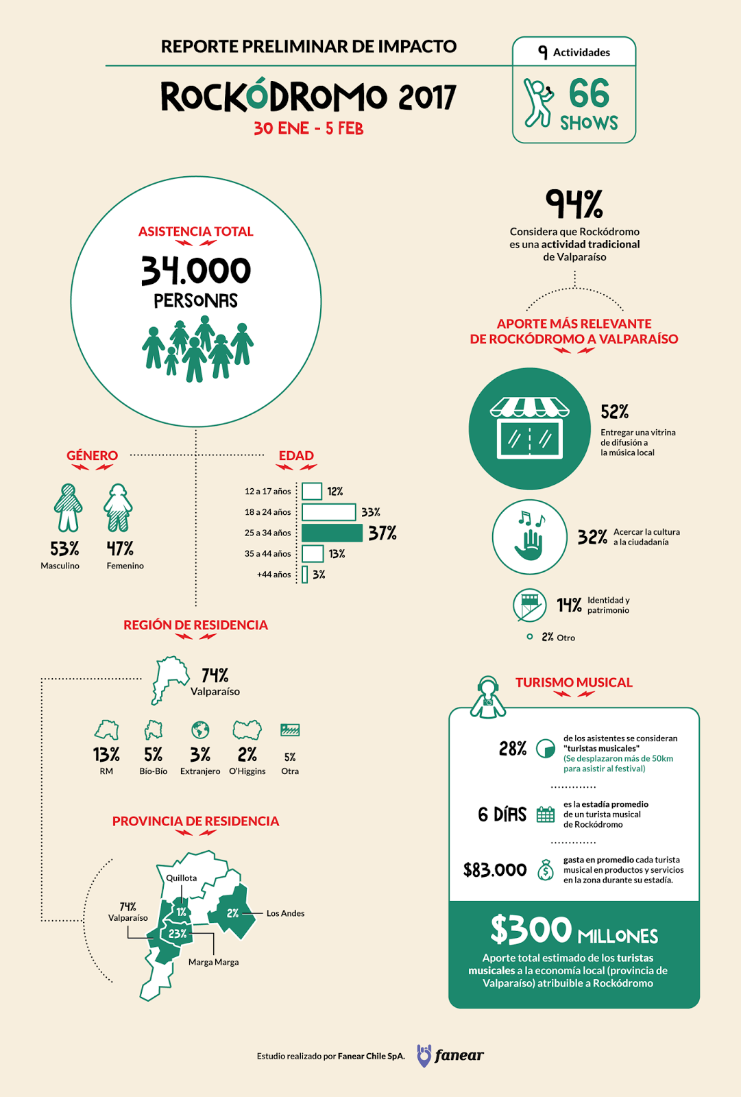 A continuación puedes revisar la infografía realizada por los chicos de Fanear, quienes tuvieron la idea de llevar a cabo el estudio de impacto económico de Rockódromo en la ciudad de Valparaíso.