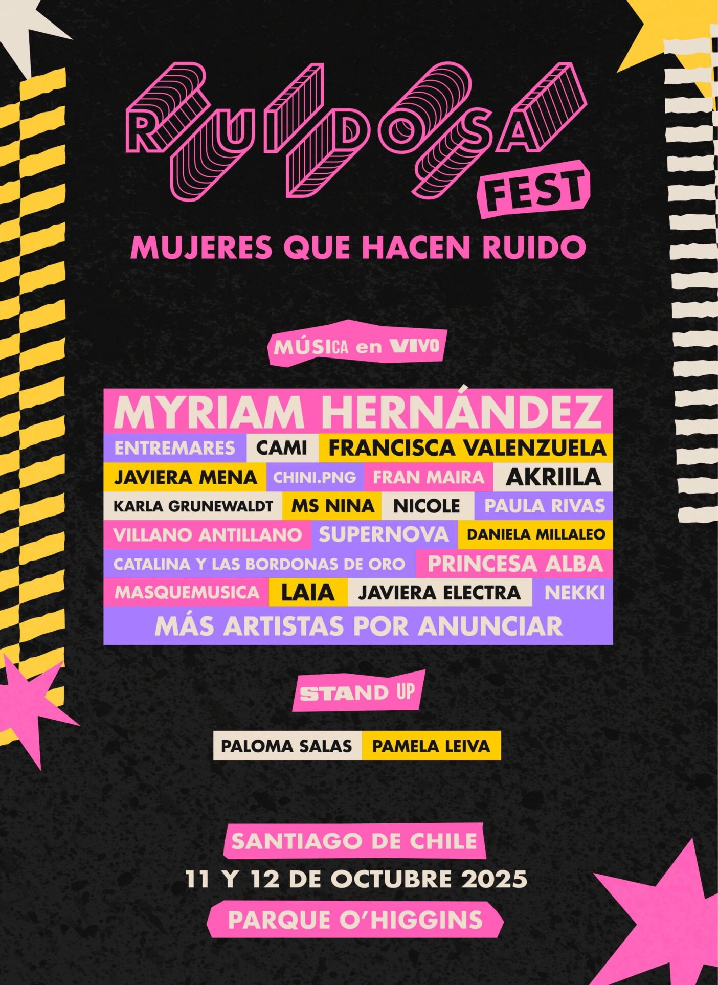 Del cartel 2025 destacan las actuaciones de Myriam Hernández, Cami, Francisca Valenzuela, Javiera Mena, Chini.Png, Akrilla, Karla Grunewaldt, Nicole, Catalina y Las Bordonas de Oro, Princesa Alba, Masquemusica y Javiera Electra, entre otras.