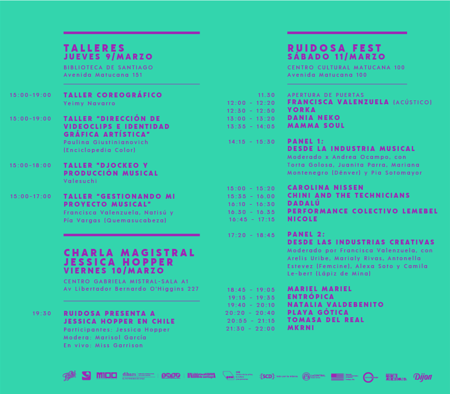 Revisa el programa completo de actividades, incluyendo los talleres del 9 de marzo en la Biblioteca Nacional y la charla con Jessica Hopper en el Centro Cultural Gabriela Mistral al día siguiente, a continuación.