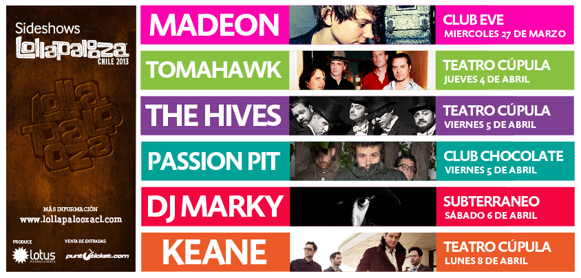 El festival internacional Lollapalooza, en su tercera edición en Chile, realizará una serie de presentaciones paralelas con artistas del cartel 2013. Tomahawk, The Hives, Passion Pit, Dj Marky, Keane y Madeon serán los protagonistas de los sideshows del festival.