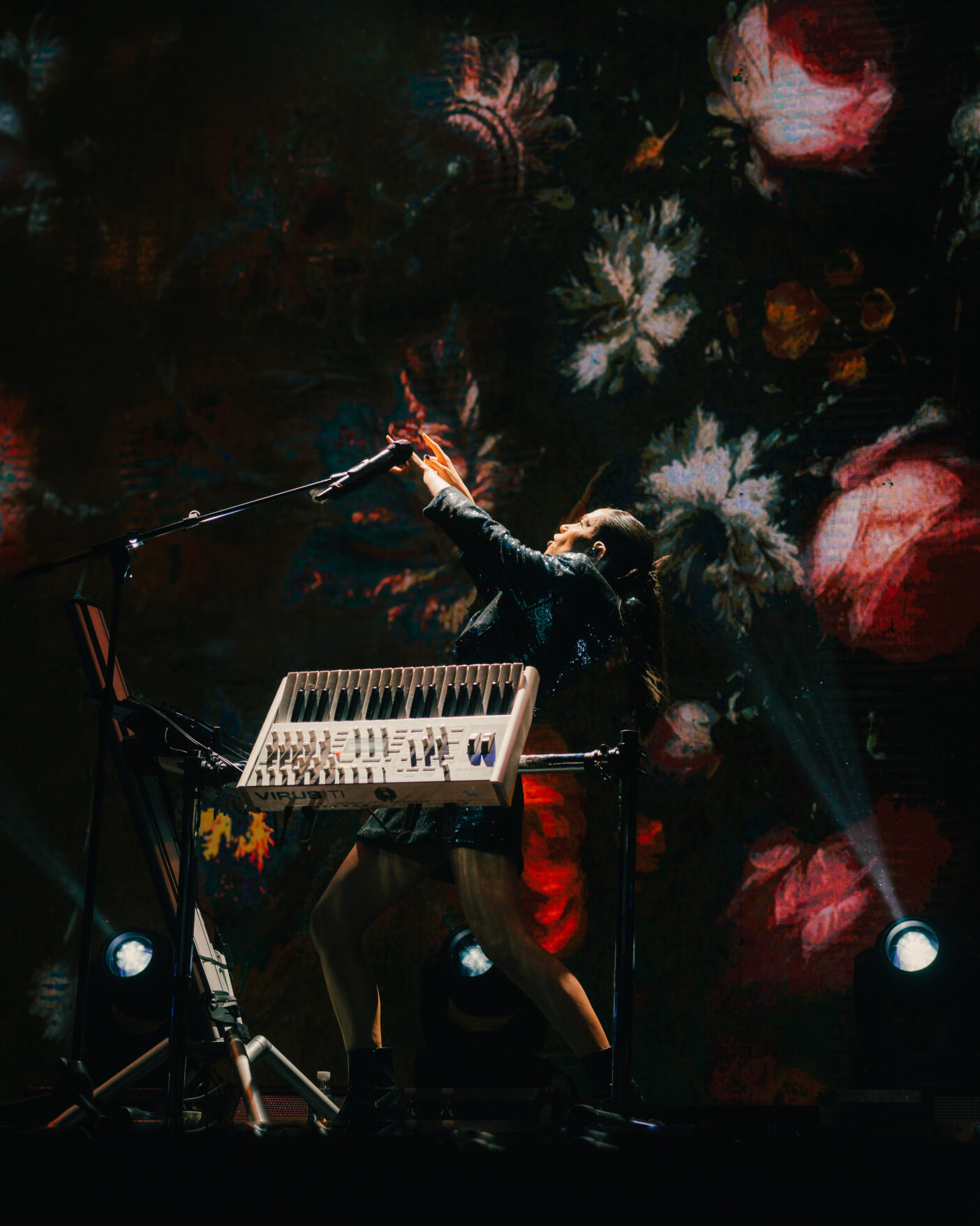 Así fue como pasadas las 9 de la noche en el Teatro Coliseo no cabía un -solo-alfiler. Del escenario hasta la puerta, de platea a galería, se amontonaban fans enfundados en glitter, moños altos engominados y banderas del orgullo. Y luego de varios vítores con el nombre Javiera en los labios, bajaron las luces, salió la banda y emergió la protagonista de la noche con outfit corte disco y una pantalla de fondo que recordaría las románticas flores del Power, corruption and lies de New Order.