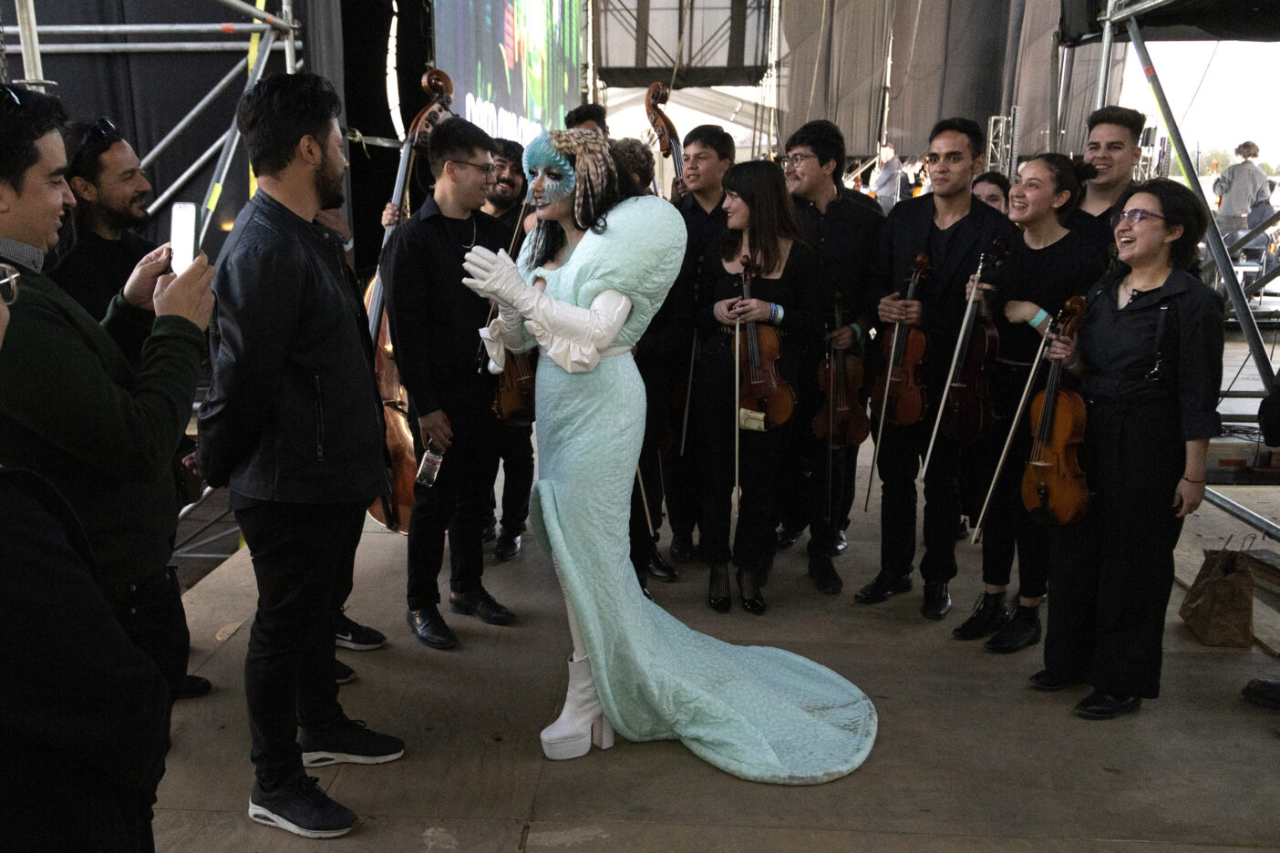 Como ya es sabido, esta gira venía acompañada de arreglos orquestales para todas sus canciones. En nuestro caso, la orquesta elegida fue la Fundación de Orquestas Juveniles e Infantiles de Chile (FOJI), que consistió en 32 músicos, entre primeros y segundos violines, violas, contrabajos y chelos. Todos comandados por el islandés Bjarni Frimann, enfundado en un top de lentejuelas negras y una falda a tono. La misma cantante dio cuenta de lo especial de la situación al decir en un golpeado español: “Hoy hay más chilenos en el escenario que islandeses”.