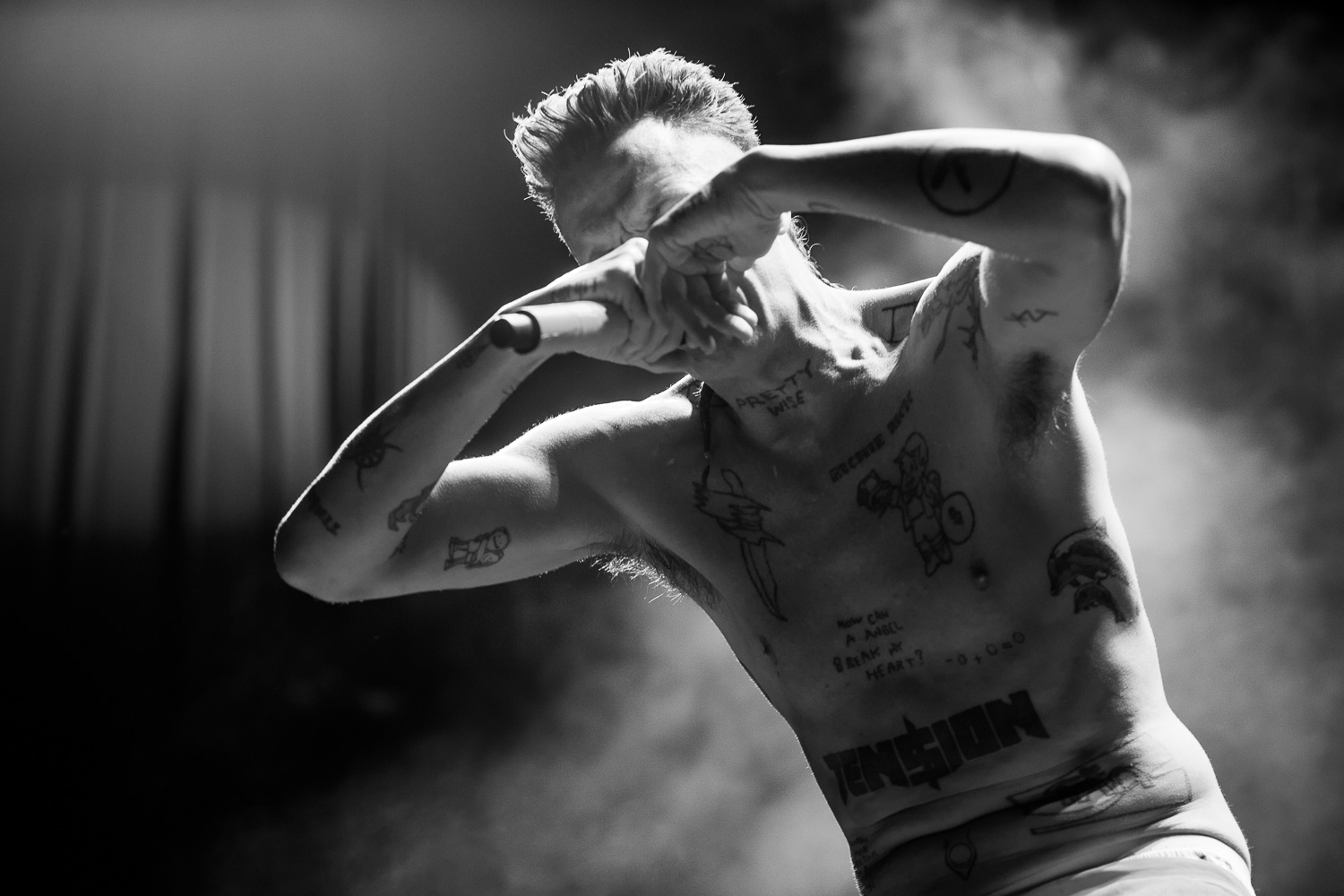 Ninja, Yolandi Visser y DJ Hi-Tek, los integrantes de Die Antwoord, entran al escenario con…